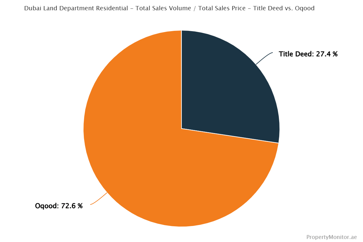 Apartments continued to dominate transaction count, driven primarily by off-plan developer sales (Oqoods), while villas and townhouses concentrated capital value through fewer but larger Title Deed (ready) transactions.
